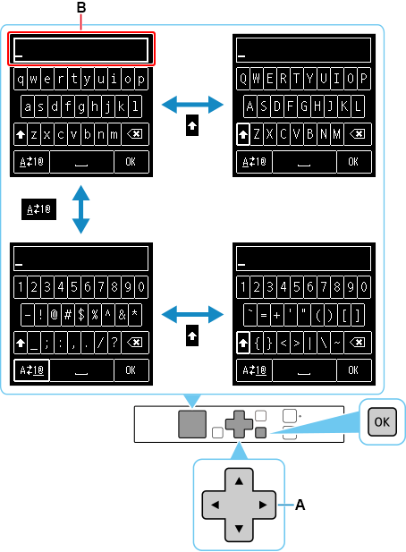 Besedilo lahko vnesete, ko je na zaslonu tiskalnika prikazana tipkovnica. Upoštevajte spodnji postopek.