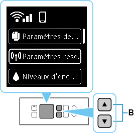 Appuyez sur le bouton Précédent (Back) (A) de l'imprimante jusqu'à ce que l'écran suivant s'affiche.