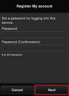 Na obrazovce pro registraci údaje „Můj účet“ zadejte v poli Heslo (Password) a Heslo (potvrzení) (Password (Confirmation)) heslo, které chcete zaregistrovat a vyberte možnost Další (Next).
