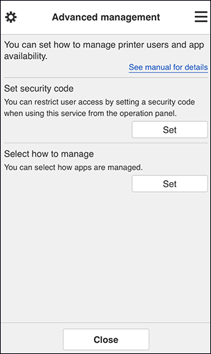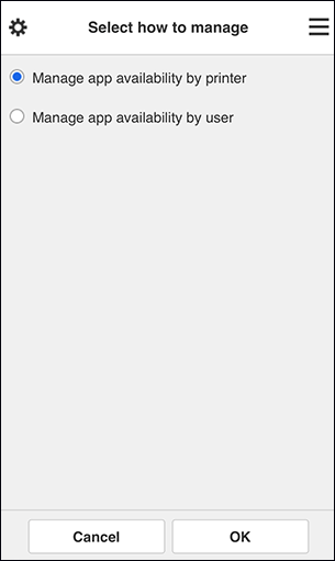 - Sovellusten käytettävyys tulostimen mukaan (Manage app availability by printer)