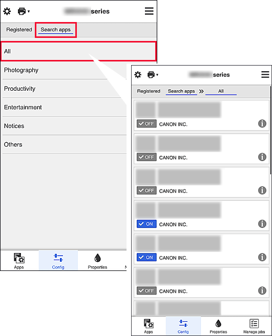 MerkAppene du kan registrere ved hjelp av Canon Cloud Printing Center, blir vist etter kategori i skjermbildet Søk etter apper (Search apps).